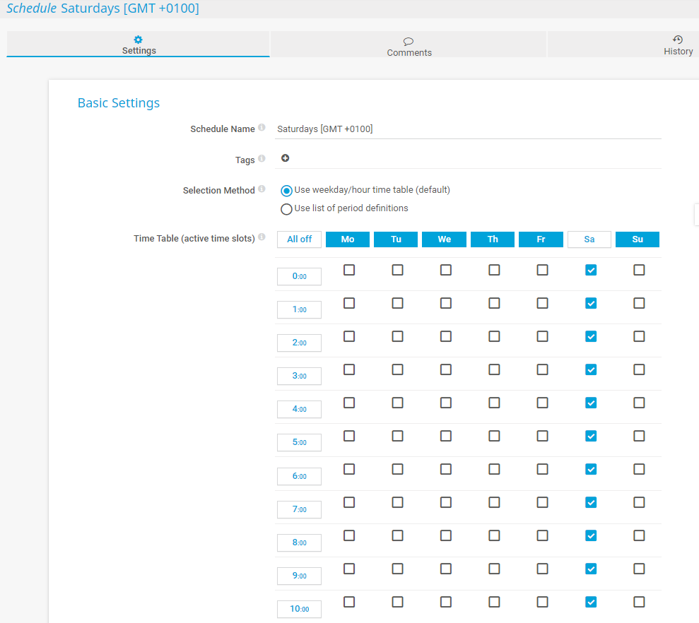 Use weekday/hour time table (default): Select specific days of the week or specific hours in which the schedule is active. This means that monitoring objects, notifications, and reports are not paused.
